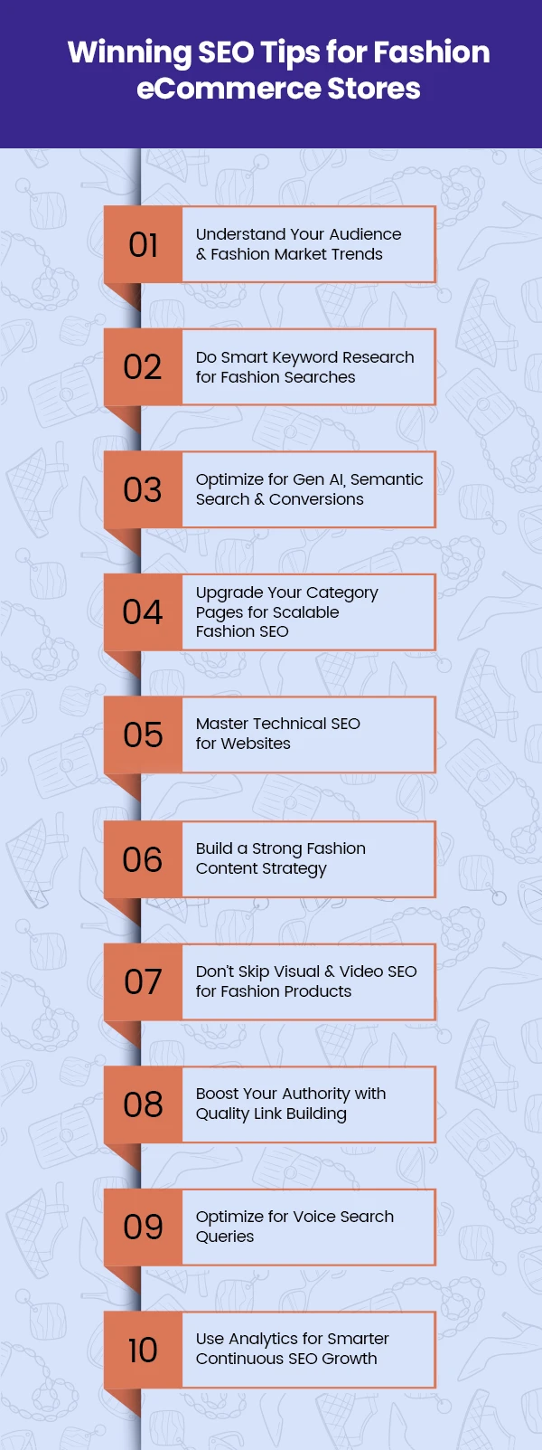 Optimizing a fashion eCommerce store in 2026 requires a holistic SEO strategy that combines technical excellence, strong content, visual appeal, and AI-driven insights.