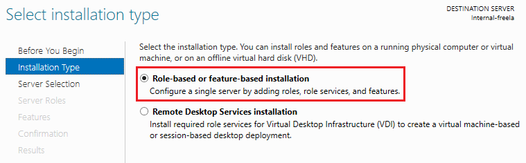 ➔ Now, it’s time to select the Installation type. In that, choose a ‘Role-based or feature-based installation.’